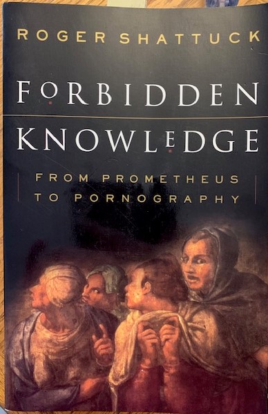 The Stuff: Shattuck divides the book into two main sections, plus three appendices. The first section deals with forbidden knowledge as a topic in literature. Reading this was fun for me. I got to read tidbits of stuff I’d read before and find things I hadn’t read before. Seldom did I agree with his interpretation of works. No, Mary Shelley wasn’t writing about forbidden knowledge or scientific trespass. She was writing about Victor Frankenstein abandoning his creation. The second part dealt with forbidden knowledge in science in the real world. His great bugaboo, the human genome project, almost seems quaint now. He also writes about the “rehabilitation” of the writing of the Marquis de Sade and his violent pornography. This was genuinely difficult for me to read. Shattuck warns the reader, not without reason, that his excerpts are graphic. The bigger question is whether such sh—er, such writing should be censored. Shattuck doesn’t call for censorship per se, but his outlook is quite conservative. In one appendix, he outlines six types of forbidden knowledge.
