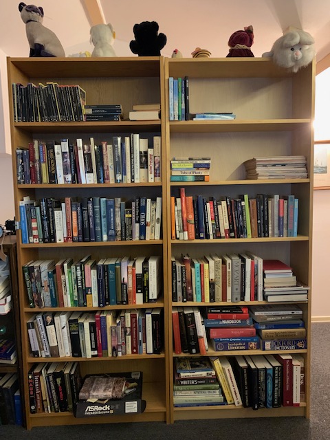 The bookcases I worked on now look like this (with their scared guardians). They are just two of many, I confess.